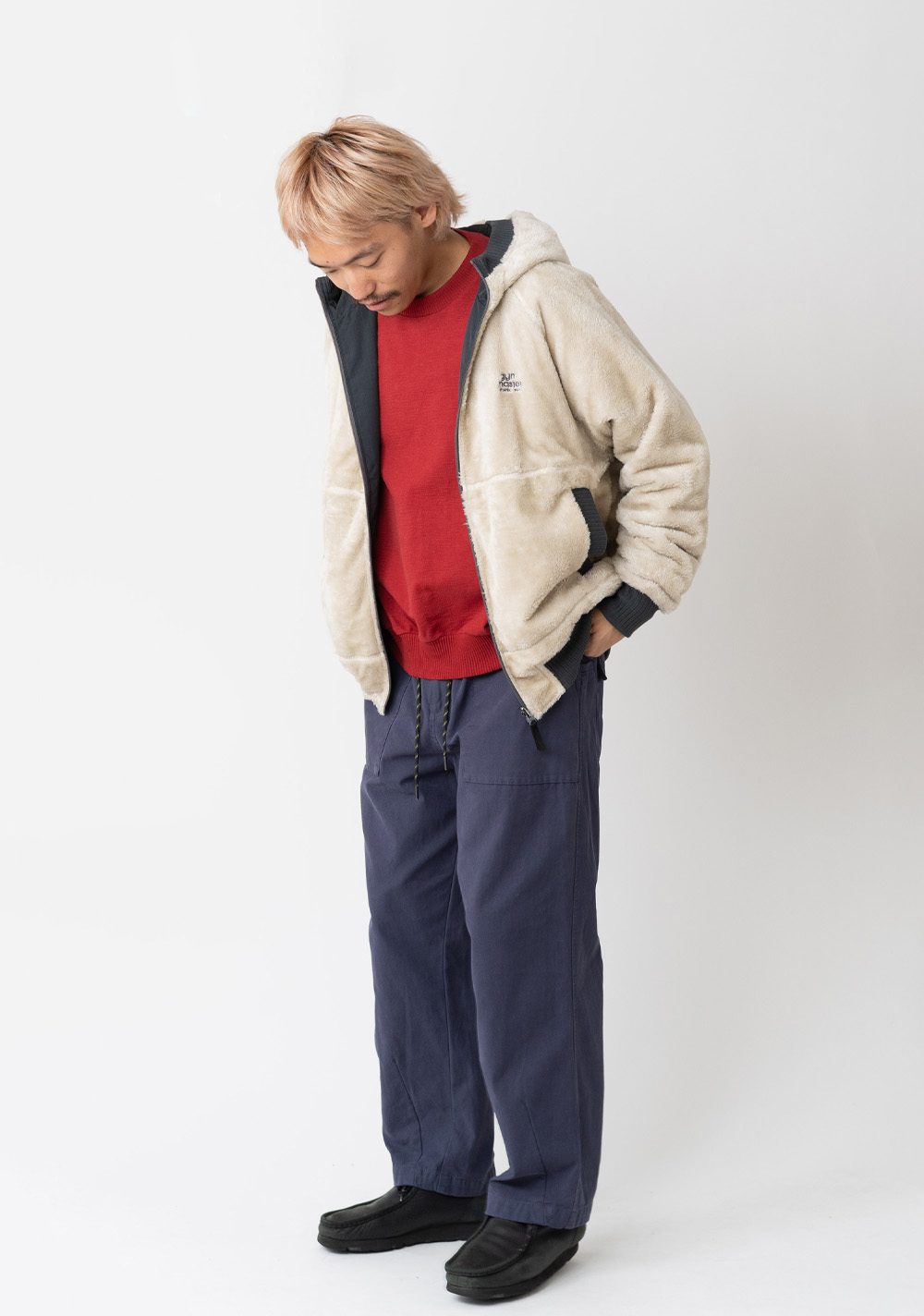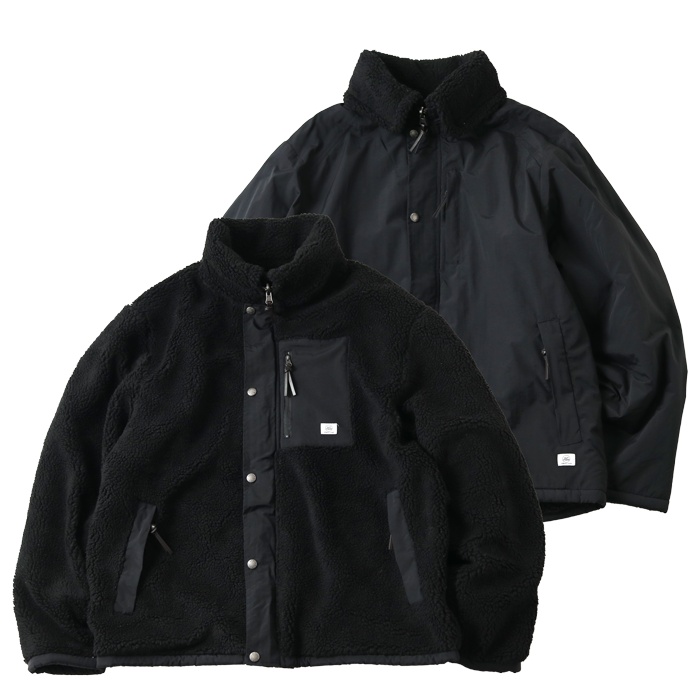 ボア×ナイロンコンビで表と裏で違うスタイリングが楽しめるリバーシブルのフードジャケット。ボア側のヒジにはナイロン素材のエルボーパッチがアクセント。襟元は防風仕様で首元の温かさをキープしてくれます。