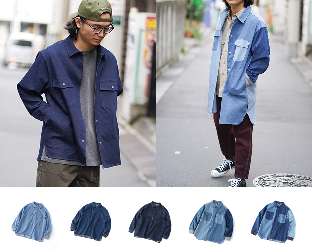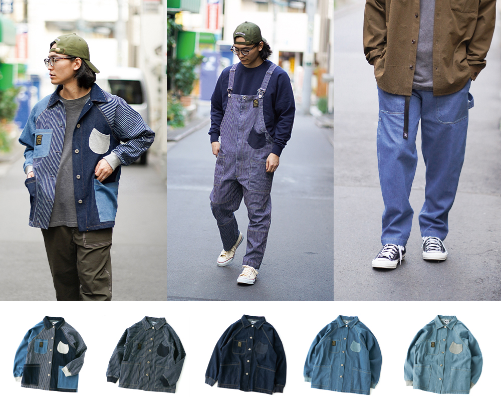 DENIM series 2020/04/15 (左から) デニムカバーオール ¥7,900(+TAX) デニムオーバーオール ¥9,800(+TAX)デニムワークパンツ ¥7,900(+TAX) (左から) ストレッチデニム シャツジャケット ¥6,900(+TAX)ストレッチデニムロング シャツジャケット ¥7,900(+TAX) 一覧へ戻る