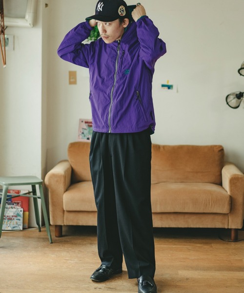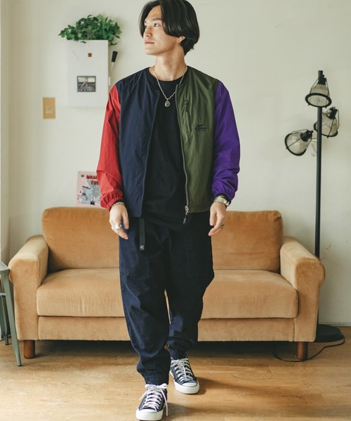 リバーシブルで使えるノーカラージップジャケット しっかりしていながら軽いナイロン素材は Tシャツの上から羽織って軽アウターとして 裾にはドローコードがついていて形も決まりやすく 保温効果もあるのが嬉しい1つ