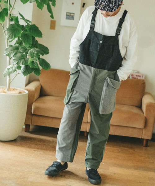 大容量のモンスターポケットで 着脱は機能的なフロントプッシュボタン仕様 大容量の大きなポケットが目を引くオーバーオール 更にバッグにはコンシールファスナーのポケット付き これひとつで手ぶらで過ごせちゃいます!